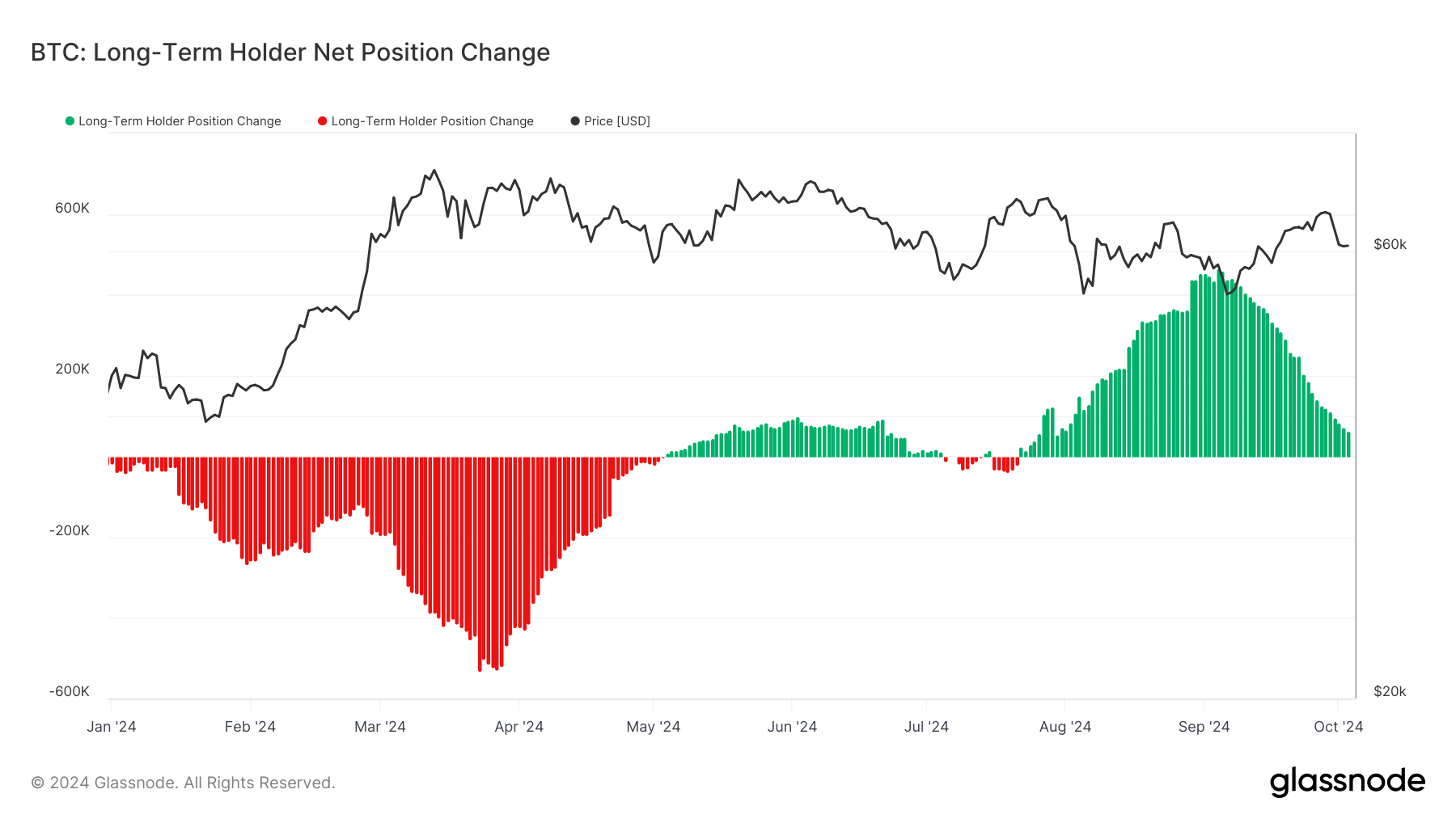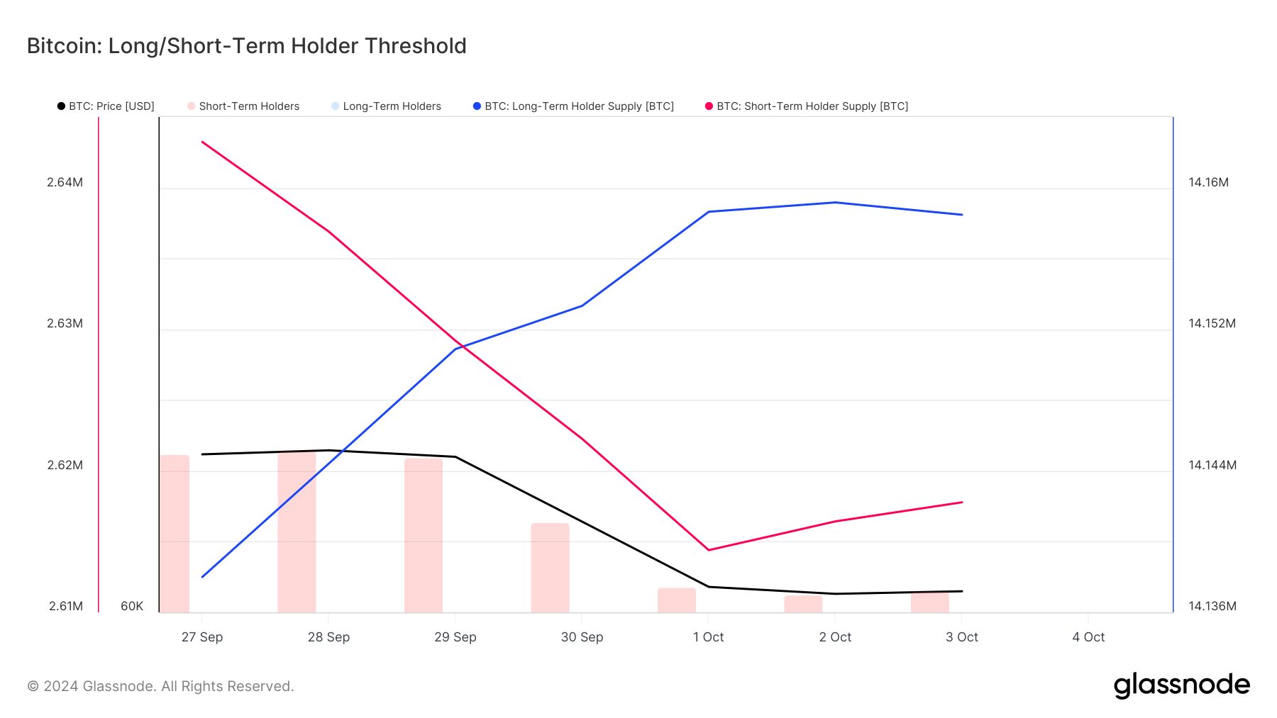 根据链上 数据 ,本周 BTC 市场显示短期持有者大量抛售,导致供应量下降并引发价格下跌。与此同时,长期持有者则选择在价格下跌时增持,表明他们对 BTC 的长期价值有更强的信心。