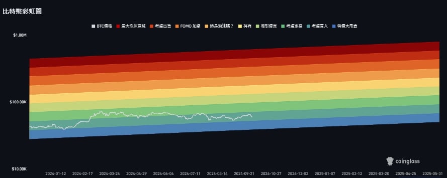 比特币彩虹图 展示 ,比特币当前价格位于「 考虑𧹒入 」区间( 6.1 万美元 ),在「 考虑定投 」阶段(7 万美元)与在「 特价大甩卖 」阶段(5.2 万美元)之间。