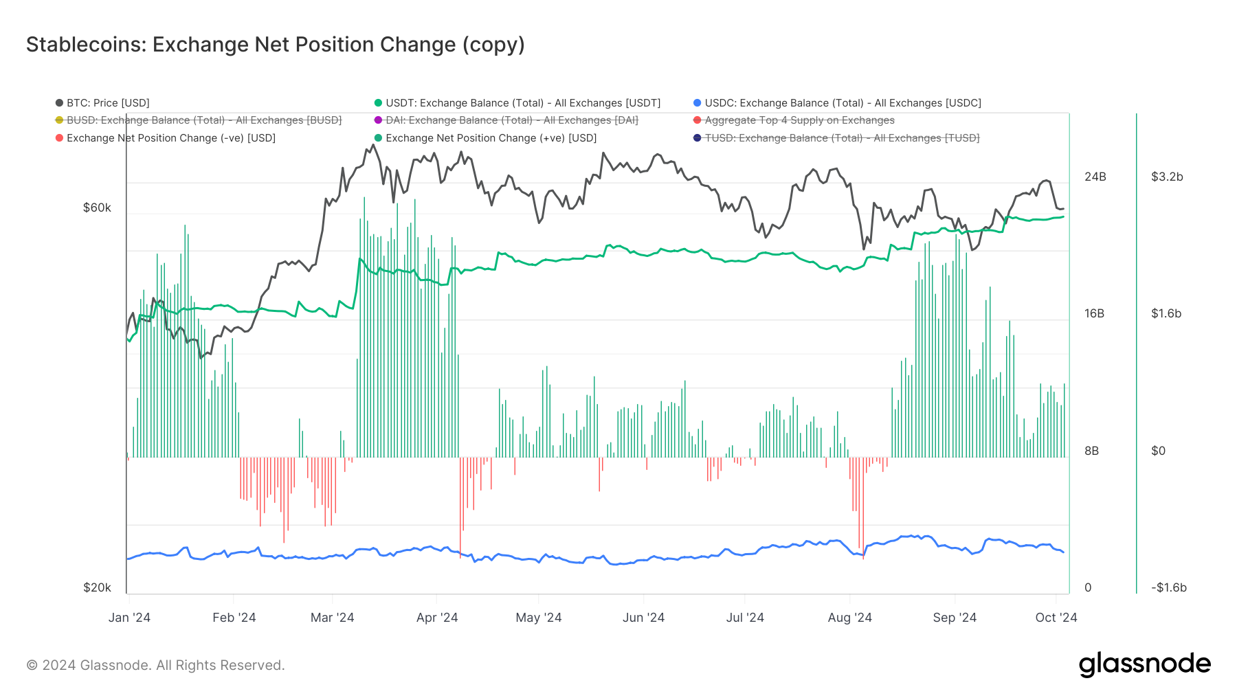 本周数据 显示 ,交易所净部位变化为正,USDT 持续增加但 USDC 本周呈现减少趋势。