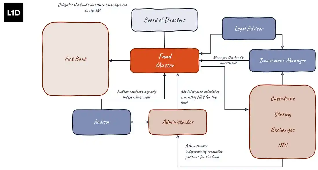 L 1 Digital 的 Fund of Funds 基金,曾经投资过 Multicoin Capital、DeFiance Capital、Castle Island Ventures 和 1kx 等知名机构,作为 VC 也曾投资过 Wintermute、amber 和 Byte Trading 等做市商。作为一家合规的加密对沖基金,L1 Digital 的团队详细解释了要做的準备和需要进行的操作流程。