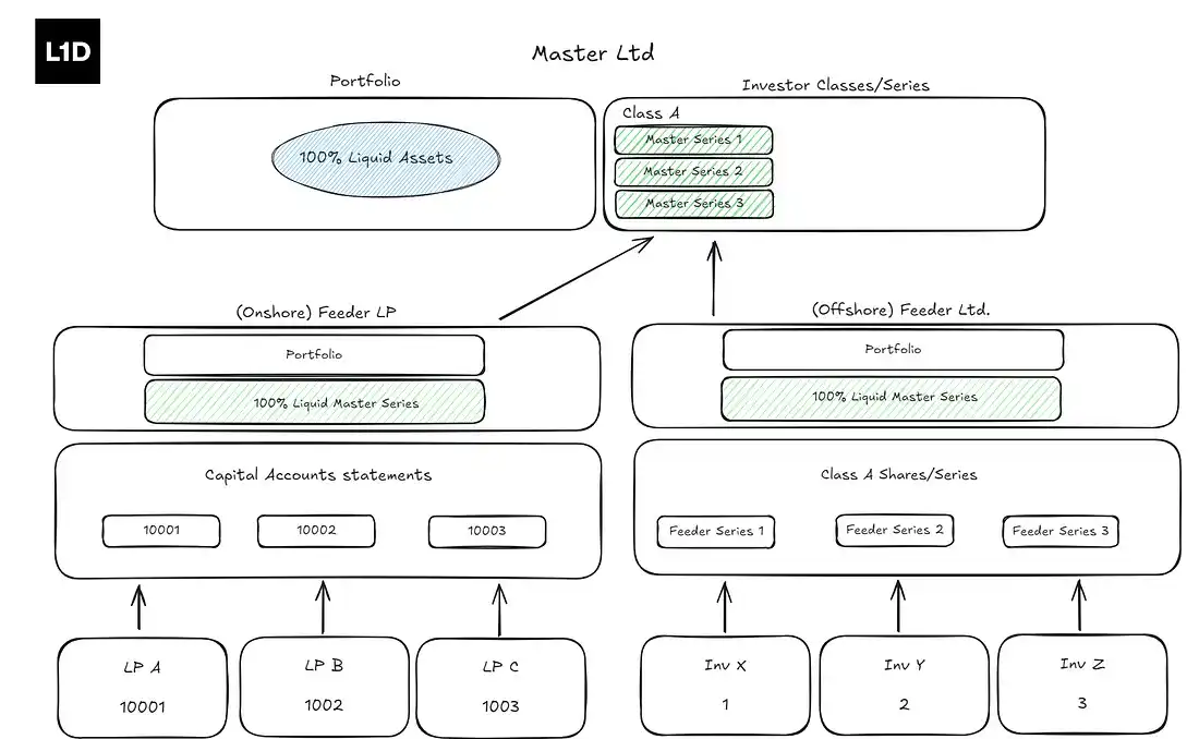 下面的图表展示了一个典型的基于𫔭曼群岛的主 – 馈基金(又称主联或母子)结构。