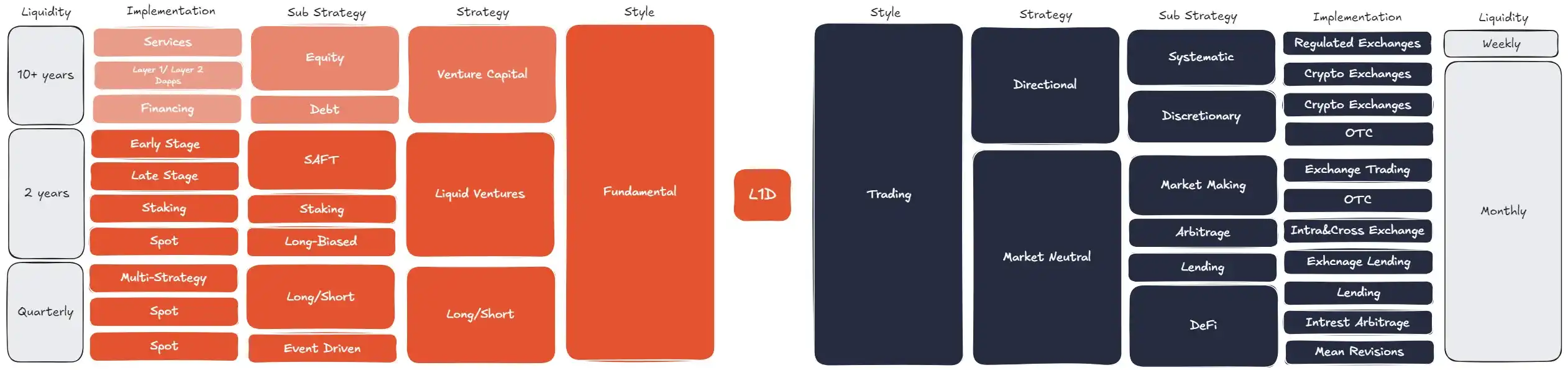 加密对沖基金的投资策略有效地定义了基金的运营特征和要求,以及为啟动做準备的相应工作流程。下面的图表展示了我们在 L1D 所分类的策略布局。