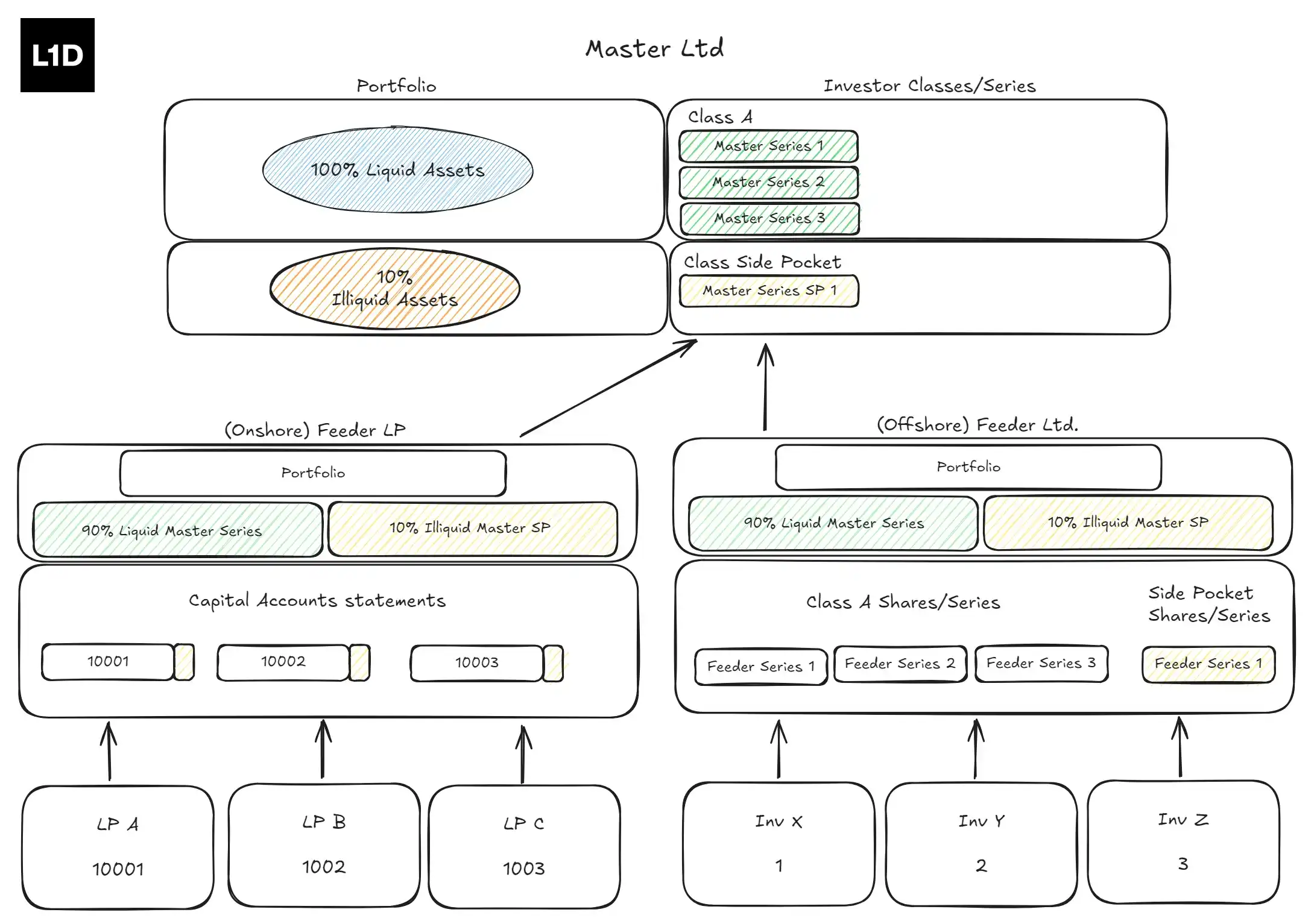 根据上面的结构图,通常有主基金和馈基金实体,主基金持有投资,参与并执行所有投资组合投资活动,并将财务收益分配给底层的馈基金。