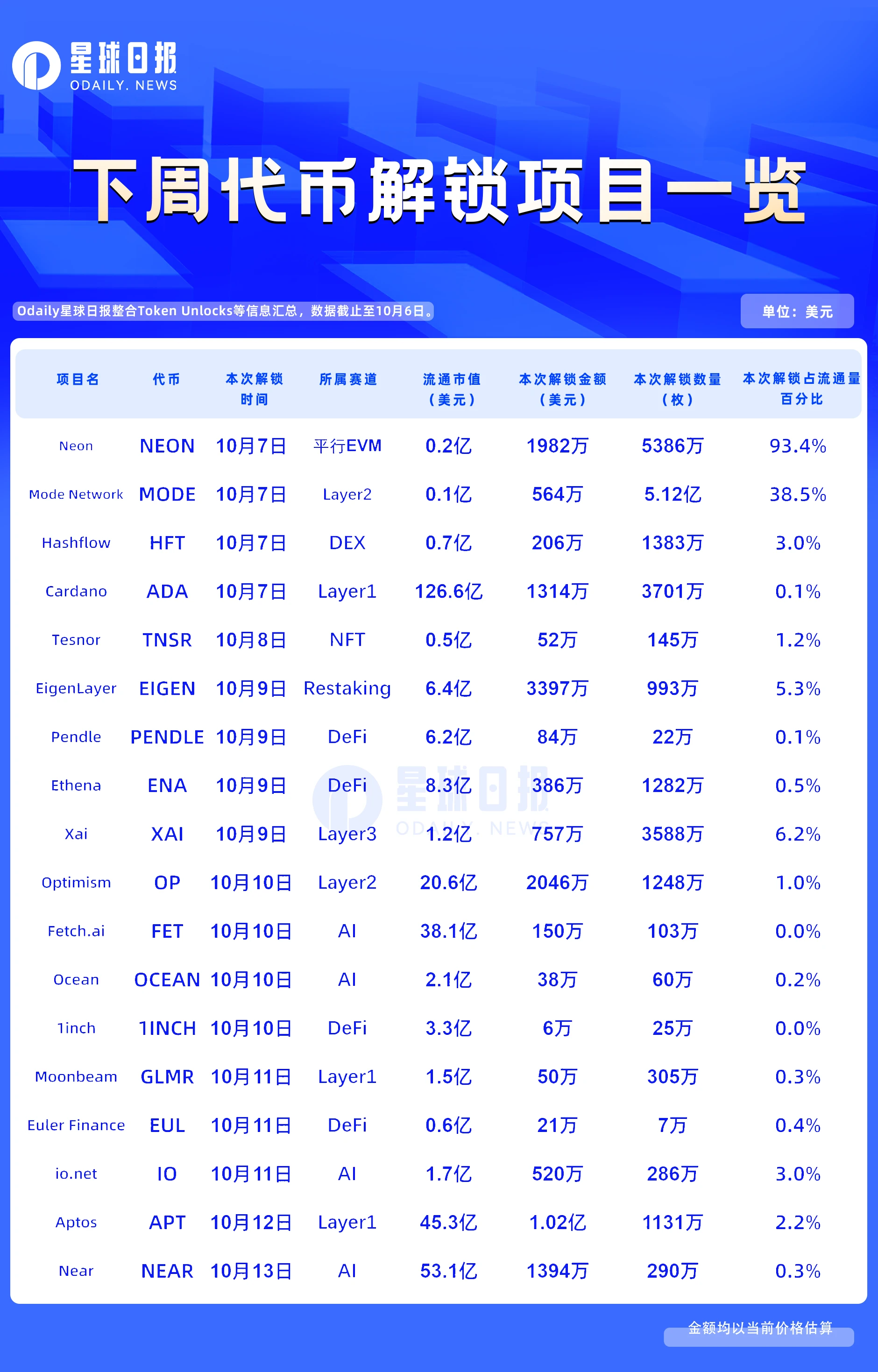 下周, 18 个项目迎来代币解锁事件,NEON、MODE 将有天量解锁,XAI、EIGEN 解锁量较大。
