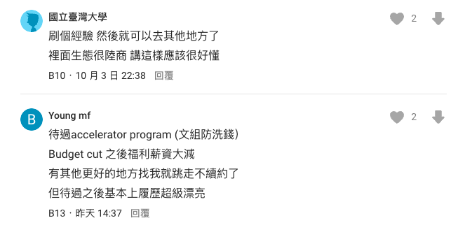 另外有一位员工曾参加币安的加速器计画,主要负责文组的防洗钱工作,随著公司预算缩减,他选择不续约,并决定跳槽到更具发展潜力的公司,不过,他也坦言,曾在币安工作让他的履历增色不少,为未来的币圈职涯发展打下了不错的基础。
