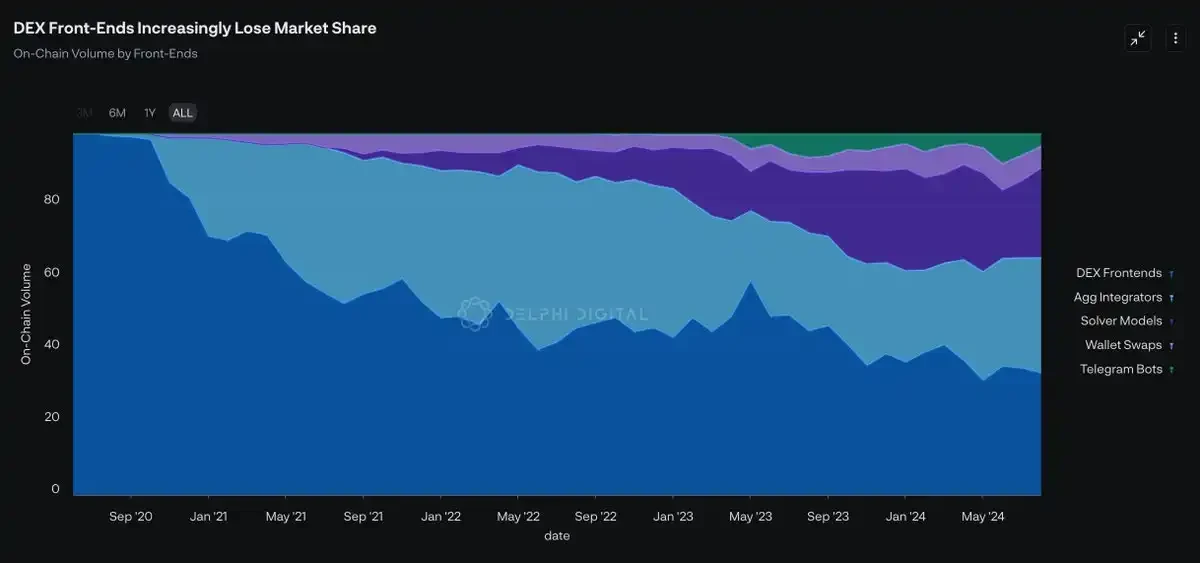 聚合器和分叉前端的流行,使得 DEX 市场的防御性问题更加复杂。历史上,如果你问我哪种模式更具防御性——去中心化交易平台还是聚合器——我的回答显然是去中心化交易平台。归根结底,前端只是查看后端的不同视角,聚合器之间的转换成本本质上较低。
