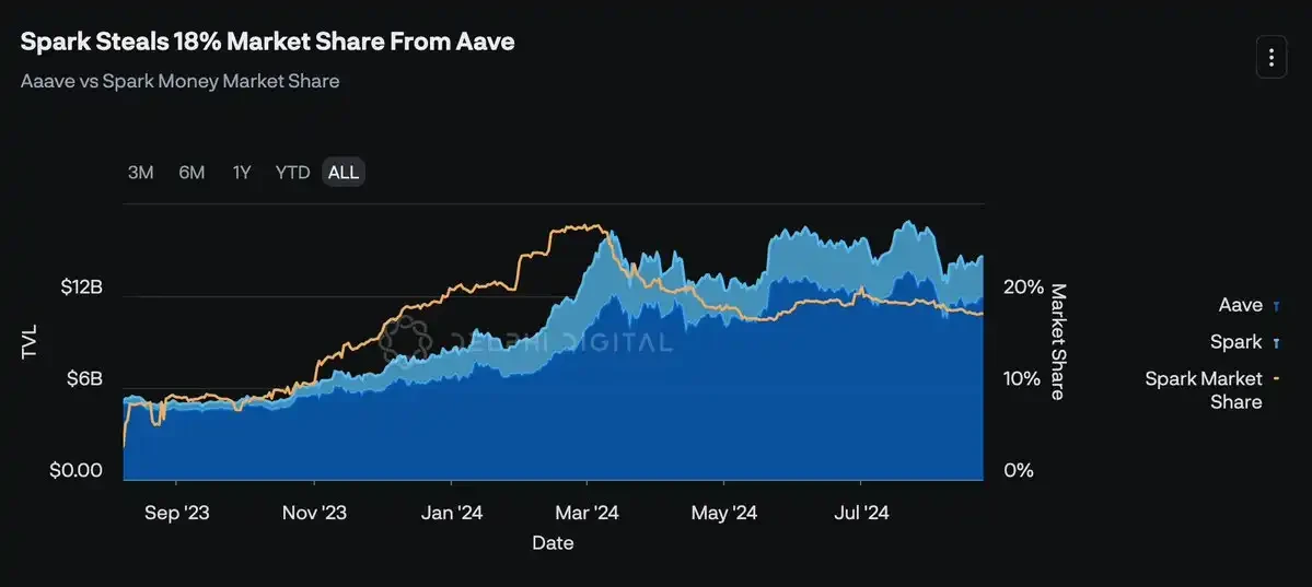 此外,值得注意的是,虽然像 Aave 这样的大型借贷市场可能能够抵御新兴竞争对手的威胁,但它们未必完全能够防御来自邻近应用的横向整合。例如,MakerDAO 的借贷部门 Spark 自 2023 年 8 月推出 Aave 分叉以来,已经从 Aave 手中夺走了超过 18% 的市场份额。鉴于 Maker 的市场地位,他们能够有效地吸引并保留用户,作为 Maker 协议的合理延伸。