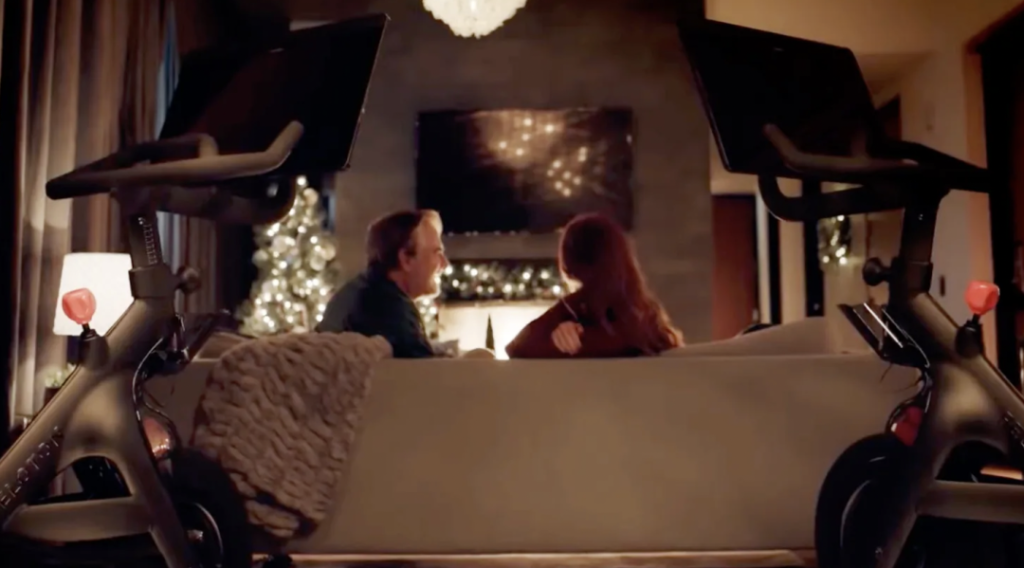 瑞安・雷诺兹迅速响应,他给 Peloton 拍了一个广告,他找来「大先生」的扮演者 Chris Noth,又找来了虚拟教练的扮演者 Jess King,让他们两位坐在沙发上调情,依偎在浪漫的篝火旁,Chris Noth 望向 Jess King,说道:这是新的𫔭始。