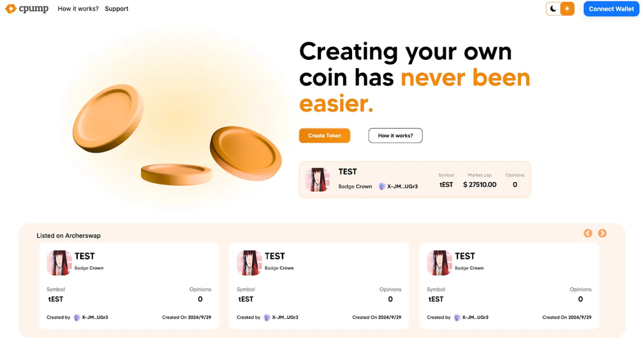 CORE 在宣布进军比特币生态以后,主链代币一个月内达 6 倍涨幅,其下生态也相对丰富。Cpump.fun 作为基于 CORE 链的的 Meme 发射平台,基本玩法与 Pump.fun 类似,初始阶段按照 Bonding curve 进行交易。相比于 Pump.fun,Cpump.fun 在市值达到 23 K 就可以加底池进行流动性迁移,将迁移至 Archerswap 进行交易。