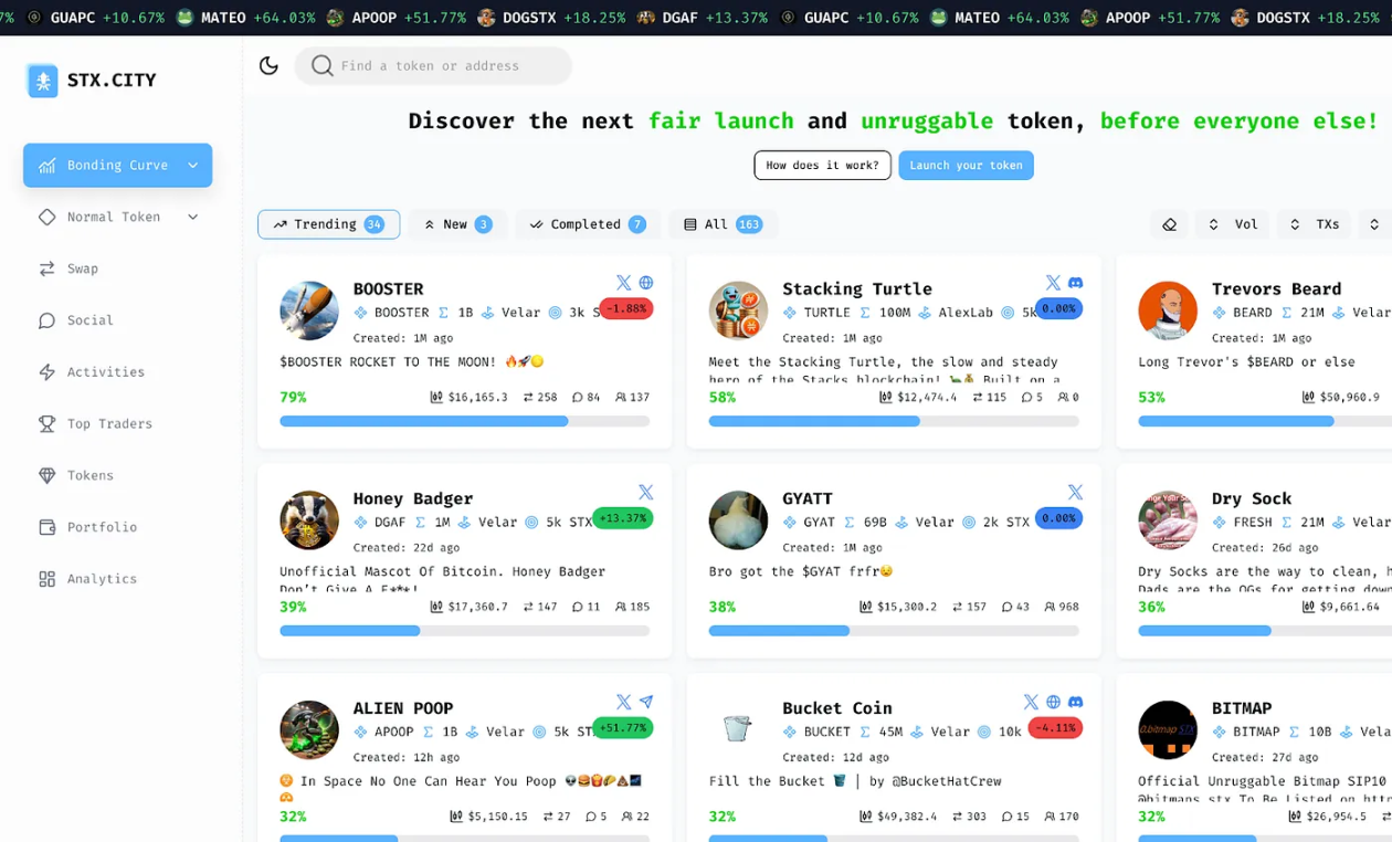 Stacks 是比特币 L2,采用金字塔方法,在底部有基础结算层,可添加智能合约和可编程性层。Stx.city 是该链 Meme 发射平台。在原有的 Bonding curve 交易完成之后,合约会燃烧剩余代币的 20% ,并与收到的 STX 配对添加初始流动性,底池 LP 全部销毁。在销毁代币和 LP 双重利好加持下,早期更易推高代币价格。