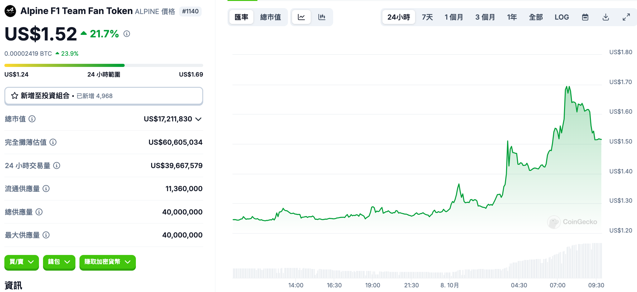 此外,F1 车队的相关代币也在这背景下迎来上涨。CoinGecko 数据 显示,BWT Alpine F1 车队的粉丝代币 $ALPINE 从昨日的 1.24 美元低点一路上攻,在今晨约 8 点来到最高 1.69 美元,最大涨幅高达 36%。