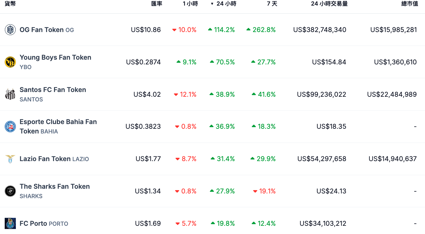 这些粉丝代币的价格和交易量受赛事的进行、球队的表现、粉丝的支持以及投机者的炒作等影响,我们可以看到这些代币的市值都不大,波动可能更剧烈,投资前请掌握相关赛事进度并严格控管风险。