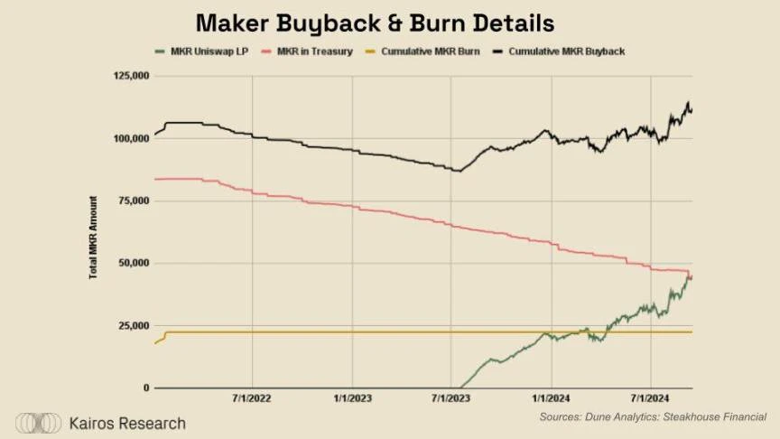在整个 2024 年,Maker 有望产生约 8840 万美元的净协议收入。MKR 的估值为 16 亿美元,仅为净收入的 18 倍。2023 年,DAO 投票决定修改协议的代币经济学,将部分收益返还给 MKR 持有者。随着 DAI 持续将借款利率(稳定费)累积到协议中,Maker 积累了系统盈余,他们的目标是将其保持在 5000 万美元左右。Maker 引入智能销毁引擎,利用盈余资金在市场回购 MKR。 根据 Maker Burn, 11% 的 MKR 供应量已被回购并用于销毁、协议自有流动性或金库建设。
