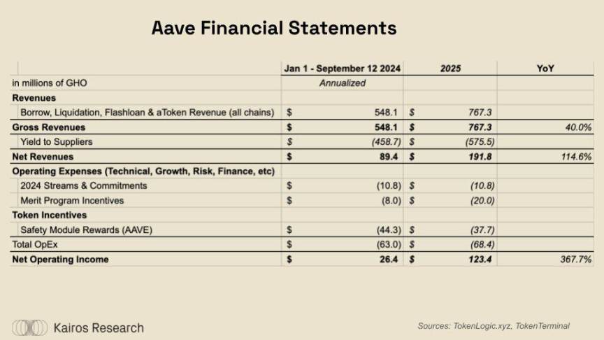 注释: 1、DAI 储蓄利率包含在收入成本中,但 Aave 的安全模块中不包含在内;2、不包括 ether.fi 代币激励,因为它们是空投形式;3、这是一个通过新产品(GHO、Cash 等)的增长率、利率、ETH 价格升值和保证金估算的粗略结果,不应被视为投资建议;4、Aave 目前正在寻求改进代币经济学,包括 AAVE 回购和分配