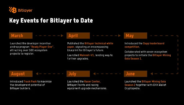 自创立以来,Bitlayer 致力于最前沿的 BitVM 和 OP_CAT 研究与开发,专注于探索比特币的潜力,并通过技术创新将可编程引入比特币系统,并专注于生态建设与用户获取。截止目前,Bitlayer 的关键里程碑事件包括: