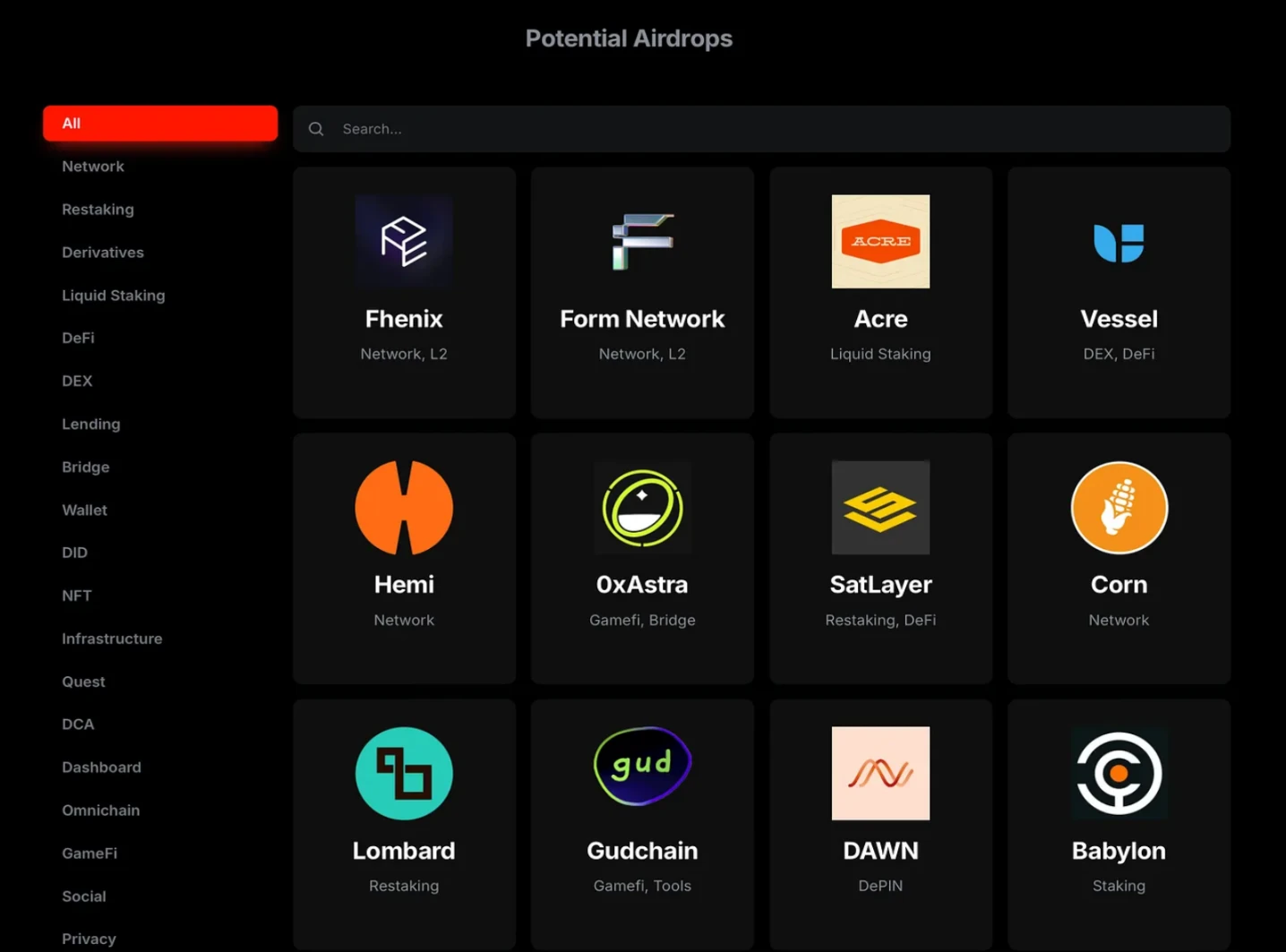 Alpha Drops 是一个方便的平台,用于跟踪各个 Web3 领域的空投。它提供用户友好的筛选器,允许您按领域选择项目。每个项目页面提供有关可用任务、资金指标和项目阶段的详细信息,无论是处于测试网还是主网阶段。