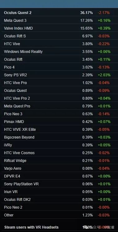 9月涨幅最大的头显是索尼的PlayStation VR2,该产品自今年8月推出PC适配器以来,使用率已在9月上涨1.68%,跻身榜单前十。遗憾的是PS VR2的HDR、眼动追踪、头显振动、自适应扳机等功能均不能在PC端使用,否则会对产品销量起到一定的促进作用。