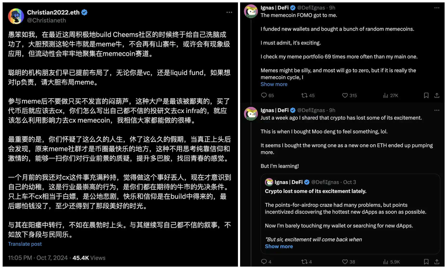 2022 年,Murad 宣布回归社交媒体,重拾对加密的热情。但直到今年,Murad 才找到新周期的主线任务,寻找真正的 Cult meme,他在接受采访时说,「2024 年初,我才开始尝试从第一性原理的角度来理解 meme 币」。6 月,Murad 便开始在社区分享他的 meme 交易哲学以及标的。