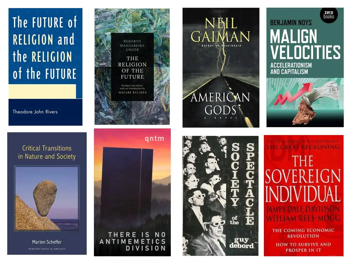 这是 Murad 推崇 Cult meme 的根本原因,Murad 给出的书单也证明了这一点,其研究 meme 的资料包括《宗教的未来与未来的宗教》、《美国众神》、《没有反模因部门》、《景观社会》等,这些书籍所做的研究都关乎于信仰与意识形态演变、文化与社会动态以及信息传播机制,对于如何理解 meme 的本质、传播机制以及对个人和社会的深远影响都有帮助。