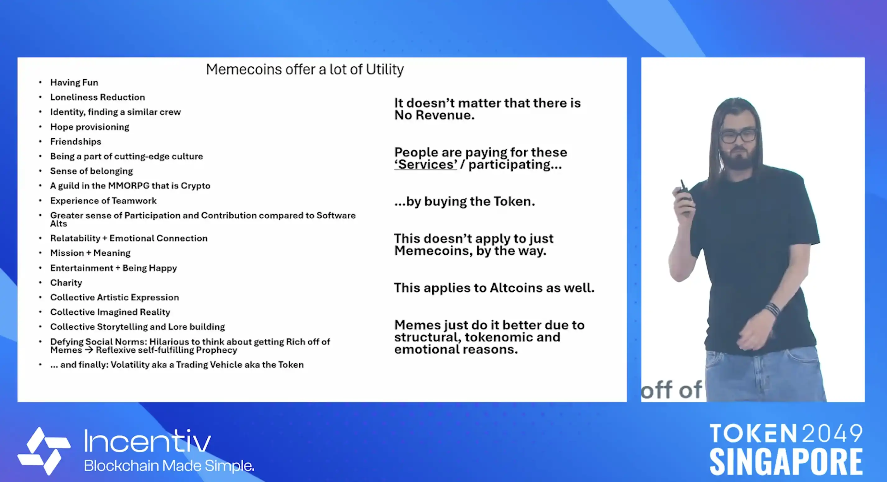 在 TOKEN 2049 的演讲中,Murad 将 meme 币颠覆 VC 币乃至所有山寨币的论调推向了极致,其所言的 meme 币超级周期核心在于市场里的人逐渐意识到 meme 币正在从价值币中偷走 meme 属性和投机溢价,「任何不向你的钱包分配现金流或不作为价值存储的加密资产,本质上都是 meme 币, 99.999% 的山寨币只不过是 meme 币加上更多步骤而已。」