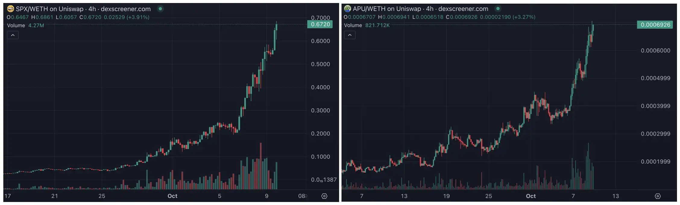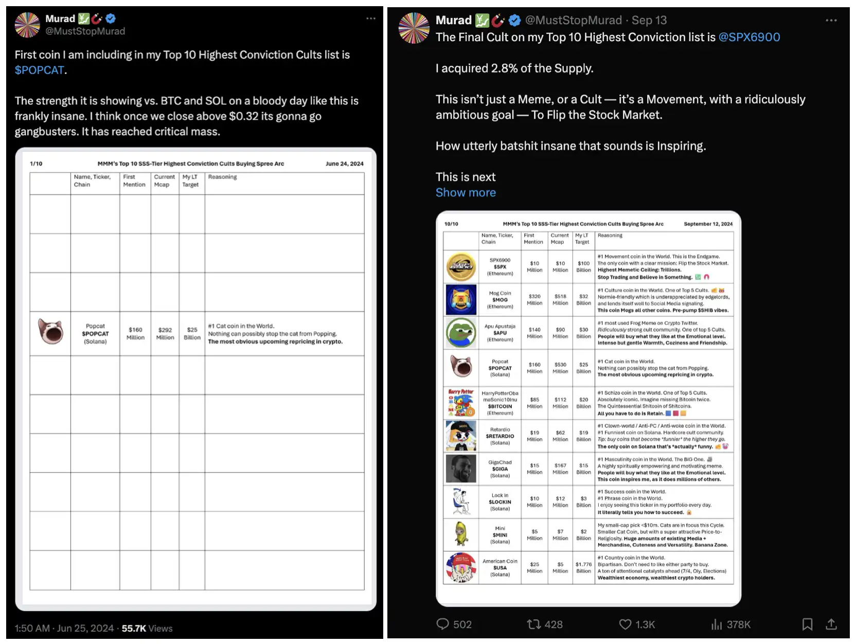 ZachXBT 披露的 Murad 地址中,其持有 SPX、APU、MINI 等三种 meme 币,而在推特上,Murad 还制作了一份包含以上三个 meme 币的榜单,此外榜单上还有 MOG、POPCAT、GIGA 等老牌 meme 币,都在近期收获了可观涨幅。而 Murad 喊单的这些 meme 币有一个共同特征,那就是都带有一些 Cult 气质。