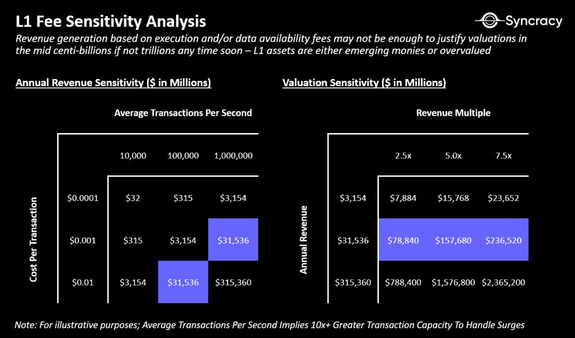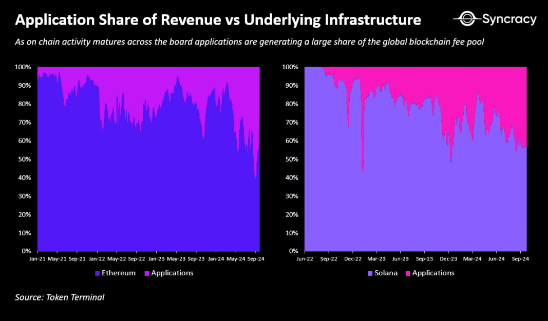 如今比较重要的问题是,随着应用在未来几年获得更多经济控制权,价值将如何在应用和基础设施之间分配。这一转变是否会成为一个拐点,促使应用在未来几年产生类似基础设施的结果?Syncracy 认为,虽然应用将继续随着时间的推移捕获全球区块链费用池中更大的份额,但底层基础设施(L1)仍可能产生更大的成果,尽管参与其中的玩家数量会更少。