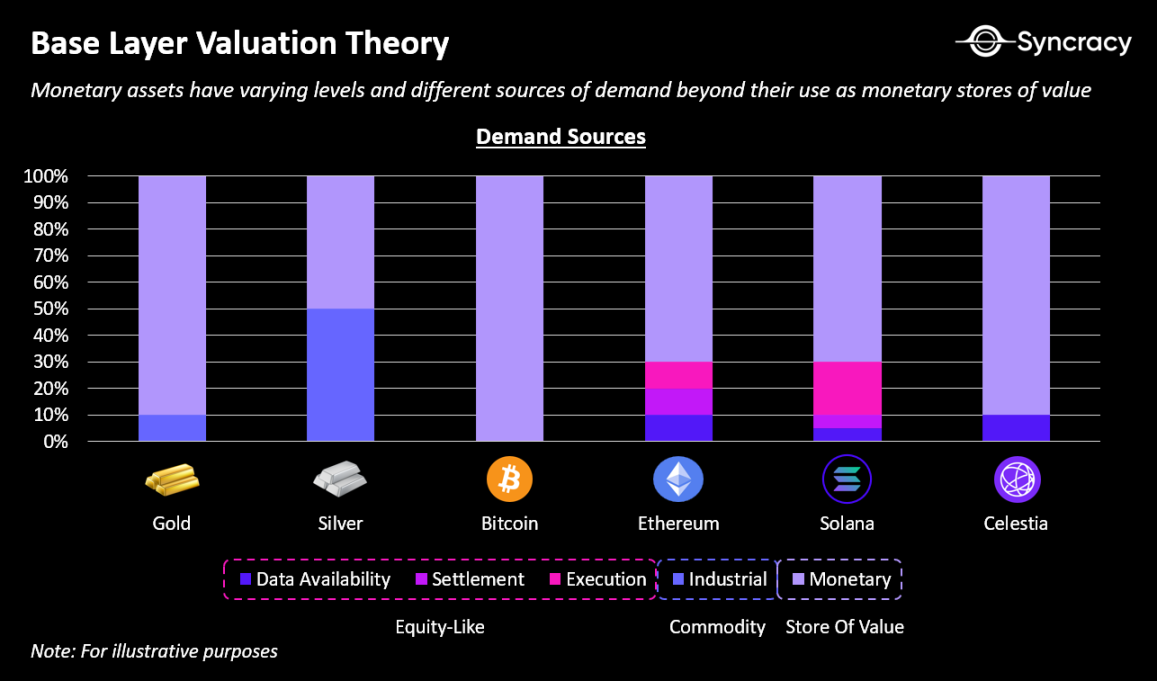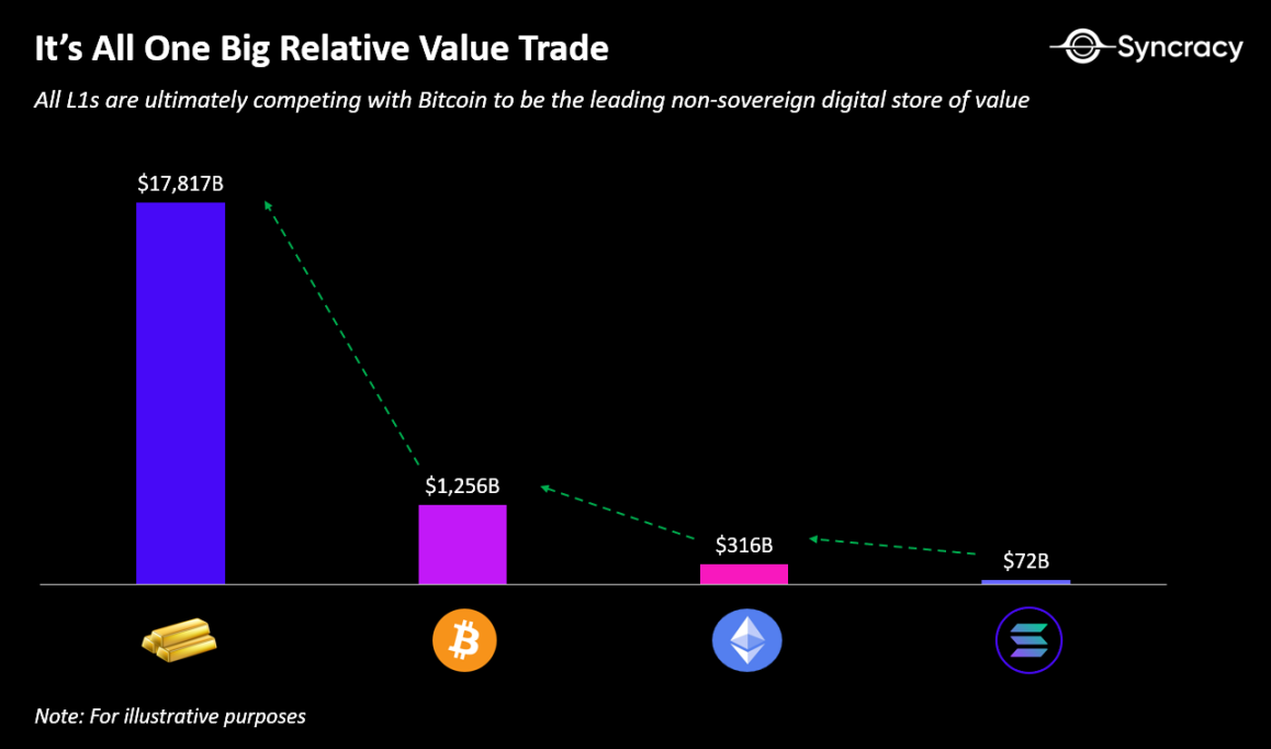 支撑这一观点的核心论点是,从长远来看,所有基础层资产,如 BTC、ETH 和 SOL,都将作为非主权数字价值储存手段进行竞争——这是加密经济中最大的 TAM。尽管人们普遍认为比特币类似于黄金,而其他 L1 资产类似于股票,但这种区分主要是叙事驱动的。从根本上讲,所有原生区块链资产都具有共同特征:它们是非主权的、不易被没收,并且可以在跨境数字环境中转移。事实上,这些属性对于任何旨在建立不受国家控制的独立数字经济的区块链都是必不可少的。
