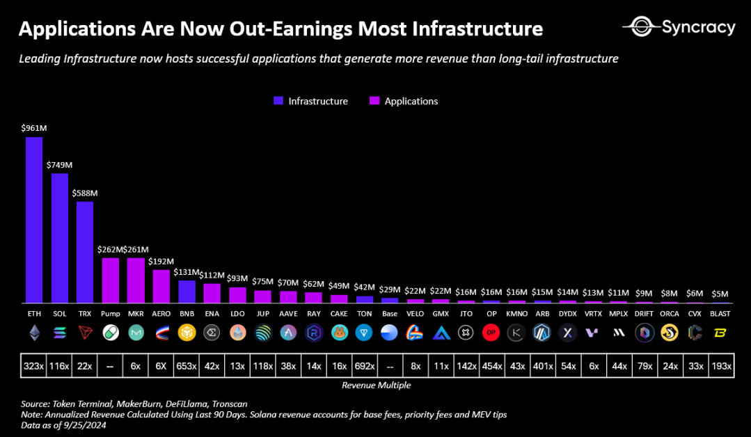 与流行观点相反,应用时代已经到来,许多应用的收入已经超过了基础设施。像以太坊和 Solana 这样的主流平台上拥有大量应用,年收入达 8 至 9 位数,且每年以三位数的百分比增长。不过,虽然这些数字令人印象深刻,但应用的交易价格仍远低于基础设施,后者的平均收入倍数高出约 300 倍。虽然像 ETH 和 Solana 这样位于智能合约生态系统中心的基础设施资产可能会保持价值储存溢价,但非货币性基础设施资产(如二层代币)的倍数可能会随着时间的推移而压缩。Syncracy 认为,市场尚未充分认识到这一现实,随着资本流入非货币类的基础设施,领先的应用将从这里开始准备重新定价,价格走高。