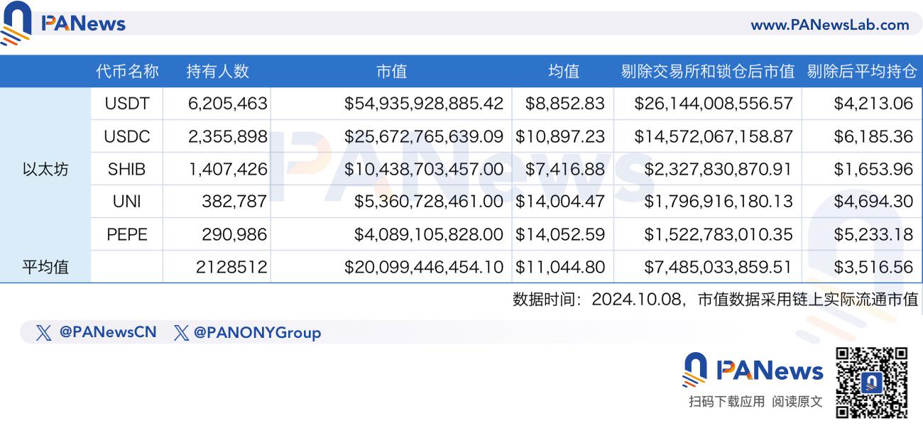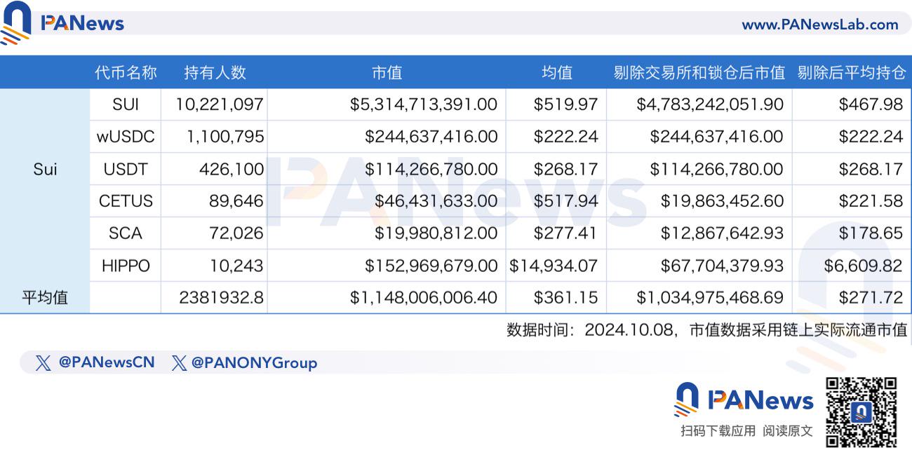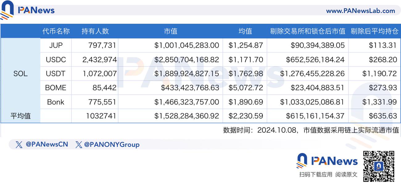 主要研究方法如下,为了更加真实的还原各个公链上的用户价值。PANews 对 Solana、以太坊、TON、Sui、Base、BSC 等几条热门公链的部分代币进行计算,由于一直以来没有现成的指标展示公链用户价值,我们通过将代币市值和持币人数相除后得到的平均值,对比这个平均值也就是这些热门代币的平均每个地址的持币价值,另外,为了更贴近真实情况,将持币地址当中的交易所地址、团队持币地址、锁仓地址等大户剔除后进行计算。当然,这个方法可能并不严谨,因为平均值从来都不代表大多数,且市值存在虚市值,但这对公链用户的价值排名具有较大参考意义。