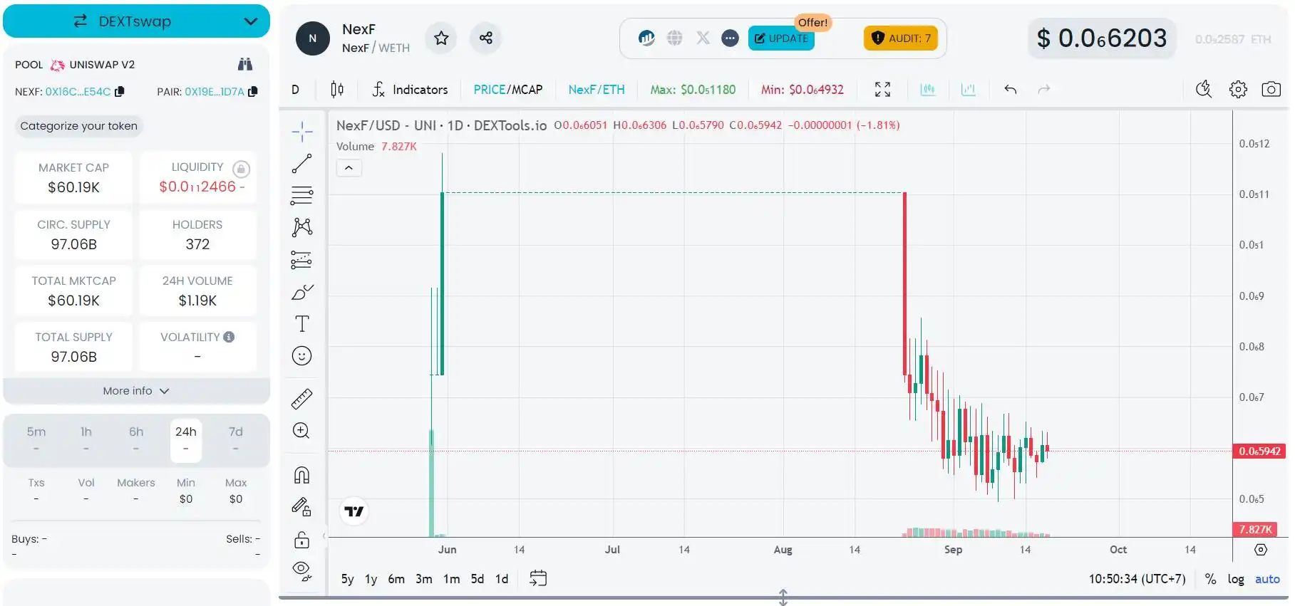 NexFundAI 代币价格图表, 截图自 2024 年 10 月 10 日上午 10: 55 的 DEXTools