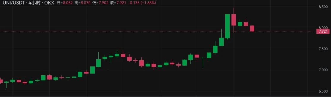 但昨日 Uniswap 推出基于 Optimistic 的 OP Stack 构建的L2 Unichain 后,一个专属于 DeFi 板块的高速度低延迟的 L2 或将改变大家对 Uniswap 未来发展的看法。 最直观的反映是 UNI 价格短时间内迅速抬升,OKX 行情显示,UNI 最高涨至 8.47 USDT,最高涨幅超 15% ,目前已逐渐回落至 7.9 USDT。