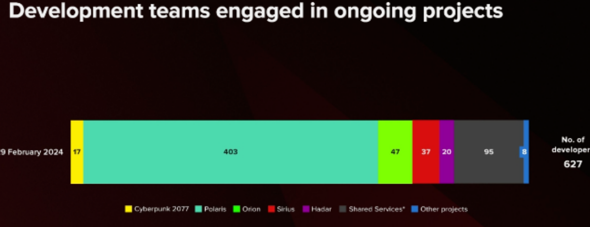 2023年财报显示,CDPR有5款新游戏正在研发中,分别是项目代号为Polaris的《巫师》系列新作、项目代号为Sirius的“巫师”IP衍生游戏、初代《巫师》重制版、项目代号为Orion的《赛博朋克2077》续作,以及项目代号为Hadar的一款全新IP游戏。
