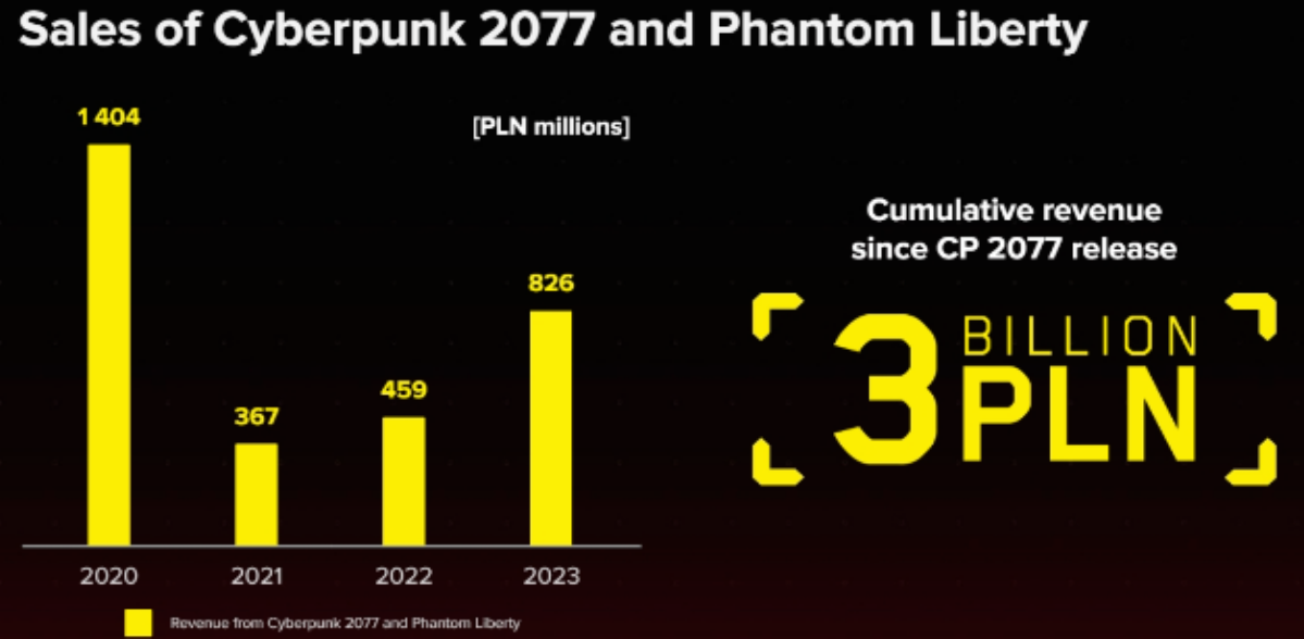 到了2024年第一季度,CDPR营收为5789万美元,净利润为2550万美元,同比增长44%。其中大部分销售额来自《赛博朋克 2077:往日之影》,该资料片在2023年售出超过500万份,全球累计收入超过7.51亿美元。