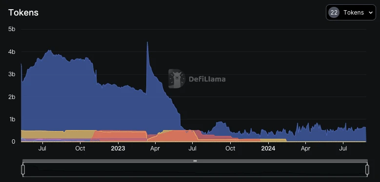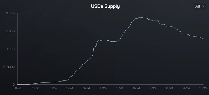 Ethena Labs 推出的 USDe 是今年热度较高的稳定币,目前已经成为市值第五大的稳定币。 USDe 虽然通过创新性的收益策略实现了 100% 的资本效率和较好的去中心化,但对于上行市场的过度依赖使其价格稳定性堪忧。USDe 今年已经经历过几次压力测试,USDe 的供应量自 7 月份以来持续减少,目前已经跌破 25 亿。