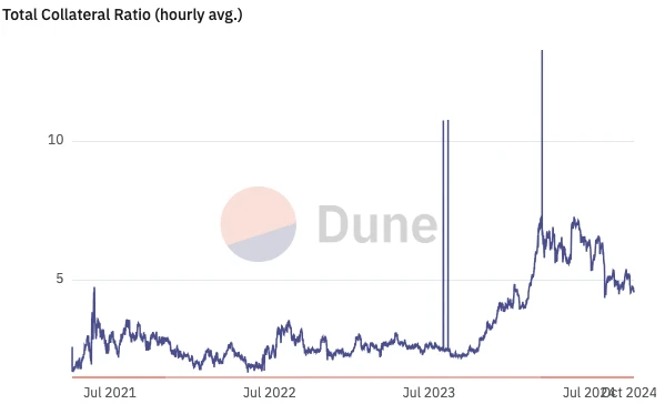 Liquity 发行的 LUSD 是以 ETH 为唯一抵押品的稳定币,在 CDP 协议中排名第三。虽然 LUSD 保证了去中心化性且最小抵押率为 110% ,但用户为了避免赎回,通常会主动将质押比率提高。根据 Dune 数据,LUSD 的抵押比率长时间保持在 250% 以上,最近上升到了 460% ,这意味着每流通 1 个 LUSD,就要有价值 4.6 美元的 ETH 抵押品支持。如此高的抵押率严重降低了 LUSD 的资本效率。