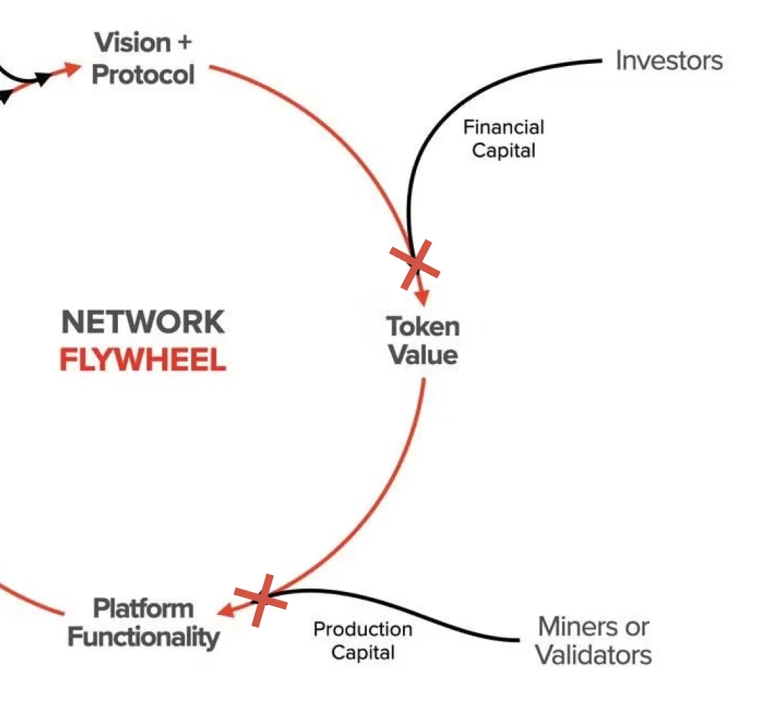 L1 网络涉及生态系统中具有不同利益的各种类型的参与者。如果将这些复杂的利益与增长相结合的结构崩溃,飞轮就会停止转动。特别是,我们应该质疑,当代币需求增加并且验证者的利益得到加强时,验证者是否一定会以其他方式为生态系统做出贡献,正如上面的飞轮模型所建议的那样。