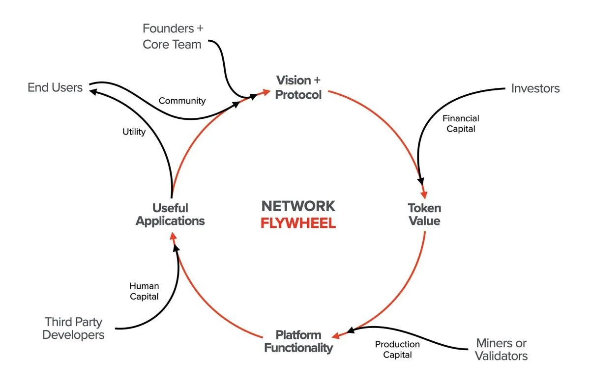 随着代币需求的上升,验证者有更强的动力去支持网络的安全性和功能性 → 这将改善网络安全性和开发环境,鼓励开发人员构建更多有用的应用,为用户提供更多价值 → 代币需求上升 → 激励措施得到加强 → 网络安全性和功能性得到改善 → 应用开发 → 社区变得更加活跃 → 飞轮