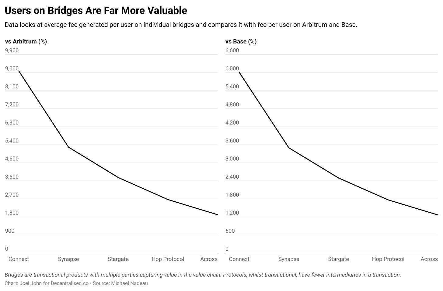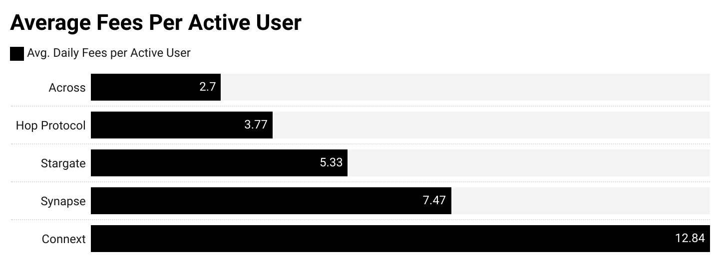 在跨链桥上的平均用户比在 L2 上的用户更有价值。Connext 的平均用户所创造的价值是 Arbitrum 用户的 90 倍。这有点像苹果和橘子的比较,因为在 Ethereum 上进行跨链桥交易时需要支付相当高的 Gas 费用,但这突出了两个明显的因素。