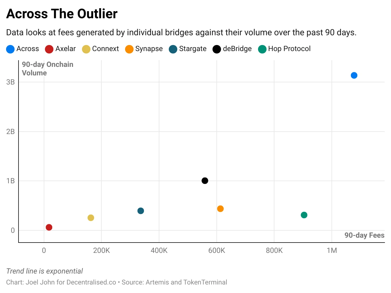 一个好的起点是查看各协议在 90 天内产生的交易量和费用。这些数据涵盖了截至 2024 年 8 月的指标,因此数字反映的是之前 90 天的情况。我们假设,由于 Across 的费用较低,因此其交易量较高。