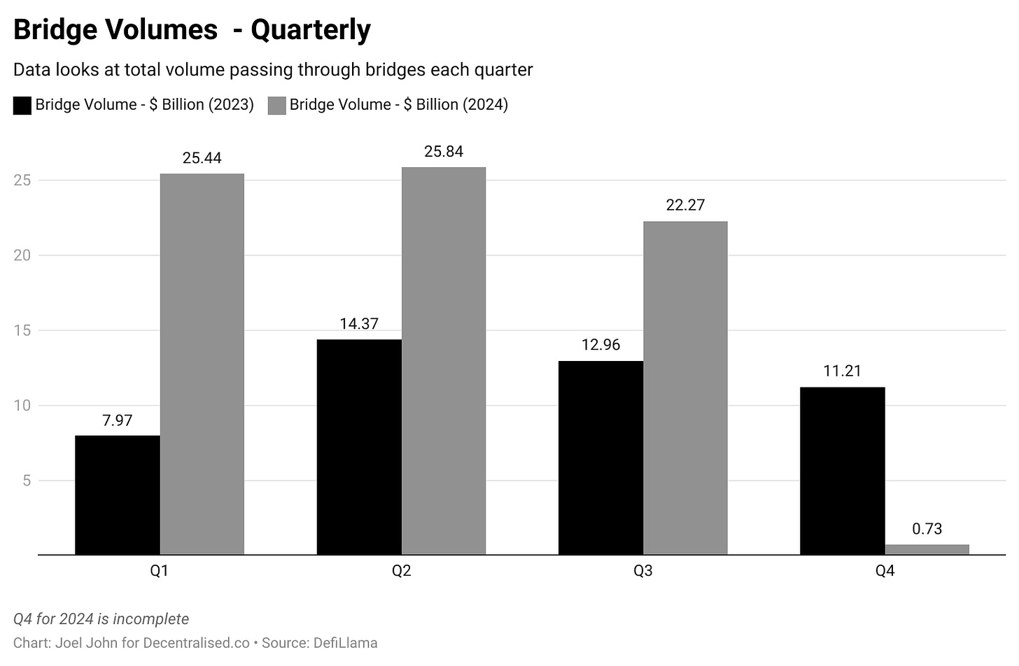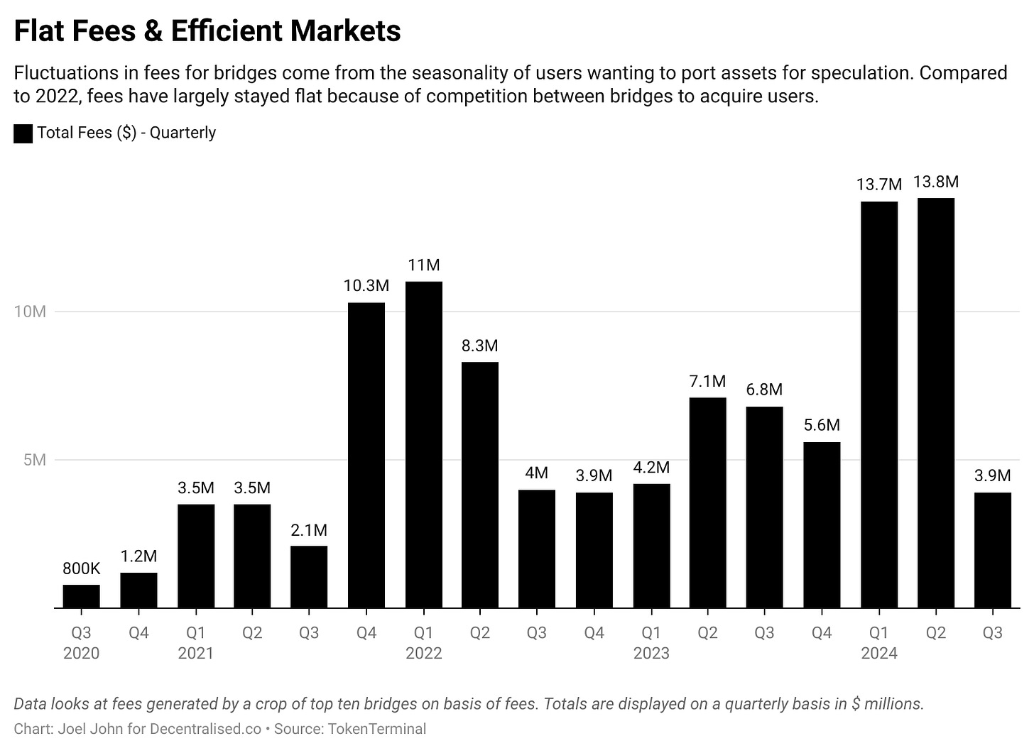 一个相当悲伤(但有趣)的比较是将跨链桥收入与类似 PumpFun .的 meme-coin 平台进行对比。他们的费用收入为 7000 万美元,而跨链桥产生的费用收入为 1380 万美元。