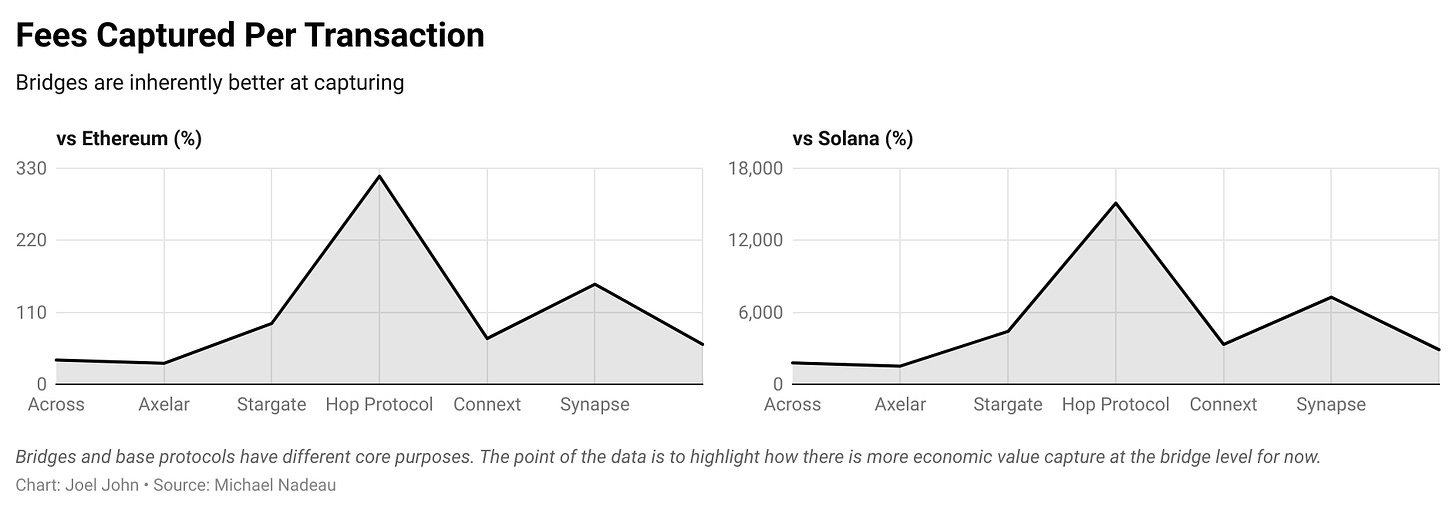 从这个角度来看,结合上述指标,一种比较两者的方法是查看个别跨链桥每笔交易捕获的美元费用,并与 Ethereum 和 Solana 进行对比。