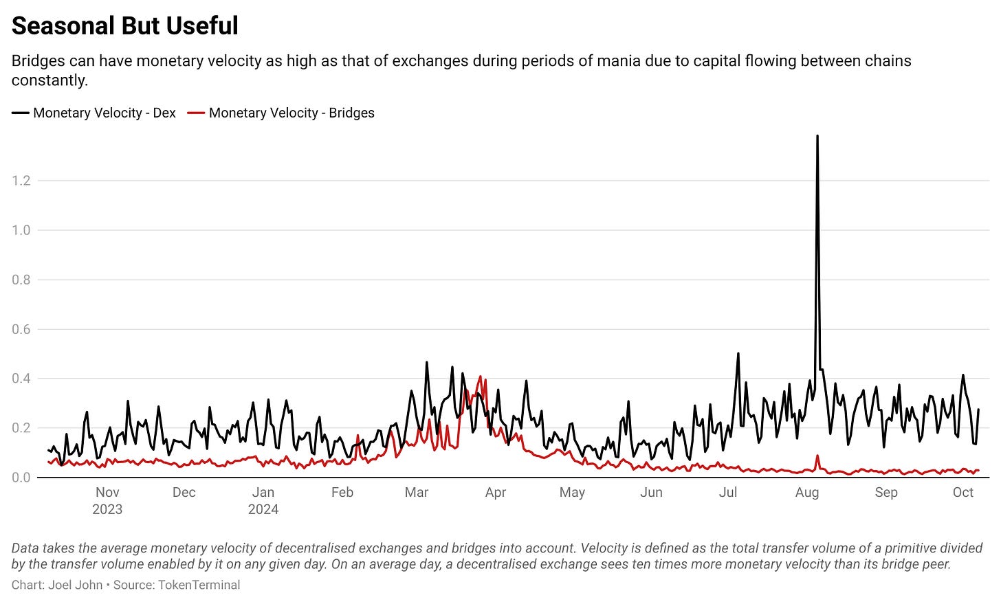 然而,令人感兴趣的是,当排除大型 L2 导向的跨链桥(如 Arbitrum 或 Opimism 的原生跨链桥)时,货币流动速度与去中心化交易所相差不大。