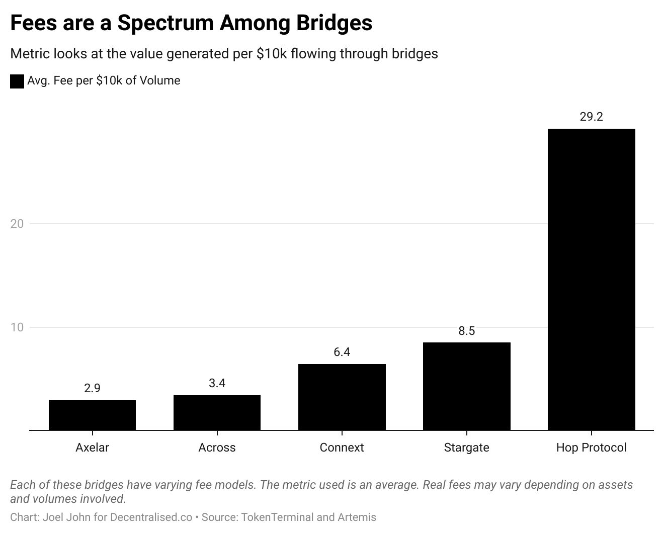 在开始之前,我想澄清一下,这并不是说 Hop 收费是 Axelar 的十倍。意思是,在一万美元的转账中,像 Hop 这样的跨链桥可以在整个价值链中(例如流动性提供者、转发者等)创造 29.2 美元的价值。这些指标会有所不同,因为它们支持的转账的性质和类型不同。