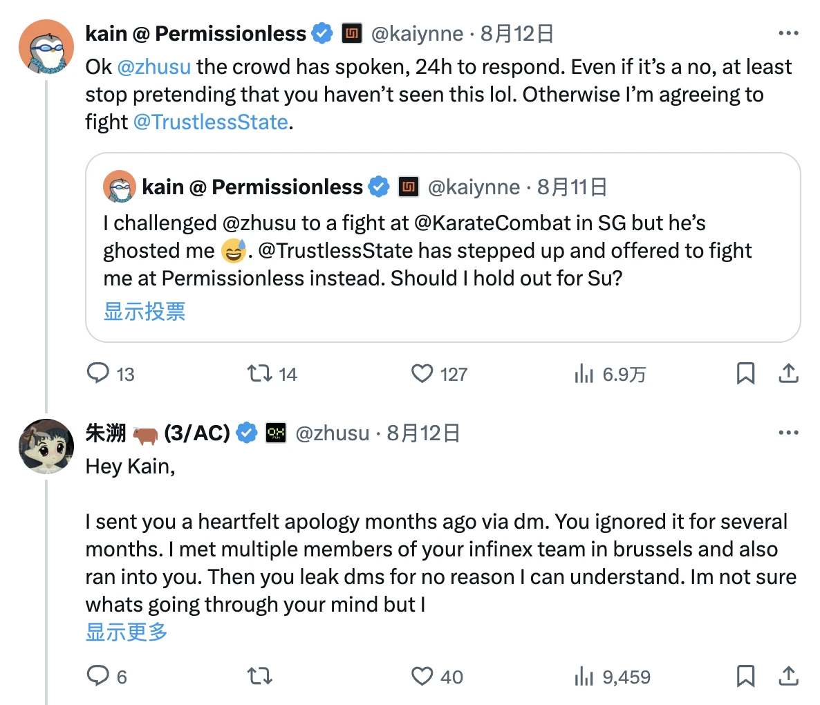 早在今年 8 月,Kain 就曾约架自己的“老冤家” Su Zhu,但遭到后者的拒绝。