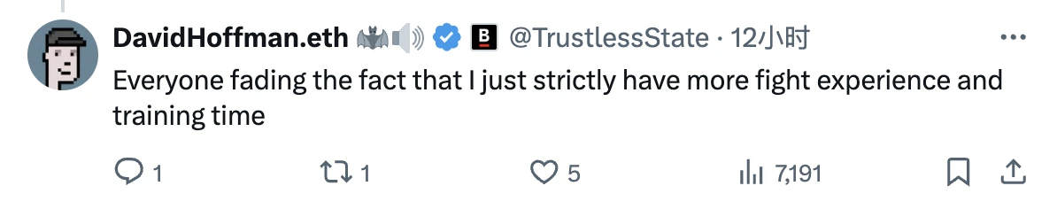 反过来,David 却有些人狠话不多的意思 —— 虽然没有晒出个人的肌肉照,但却在 X 发文表示:“每个人都忽略了我拥有更多战斗经验和训练时间的事实。”