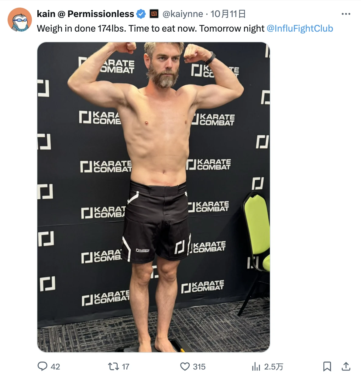 本次比赛开始前,Kain 昨日曾晒出个人的身材照片,称已完成称重,随时准备开战。这一昂扬的斗志也鼓舞了 Polymarket 上的 Kain 支持者。