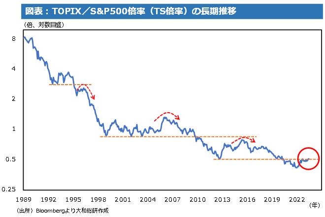 东证股价指数 / 美国标准普尔 500 指数倍数的历史数据(用以衡量日本股市在全球地位的指标之一)数据来源:Daiwa Institute of Research