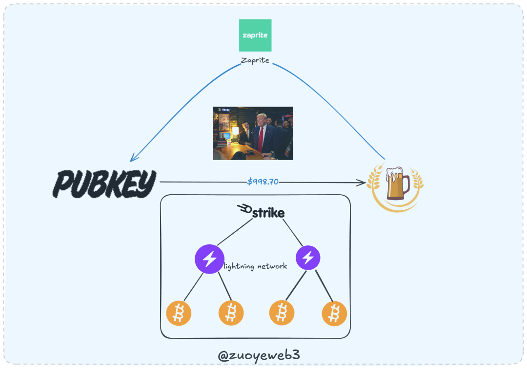 一个正常的 Payments,需要商家侧和用户侧的支持,但这恰恰是目前的行业短板,我们以顶流男企业家川宝来说明这个问题,2024 年 9 月 19 日,川宝莅临了纽约的 PubKey 酒吧,并且买了只要 998 的啤酒,以飨支持者,川宝用的是 Strike 发起支付,商家用 Zaprite 来收款。