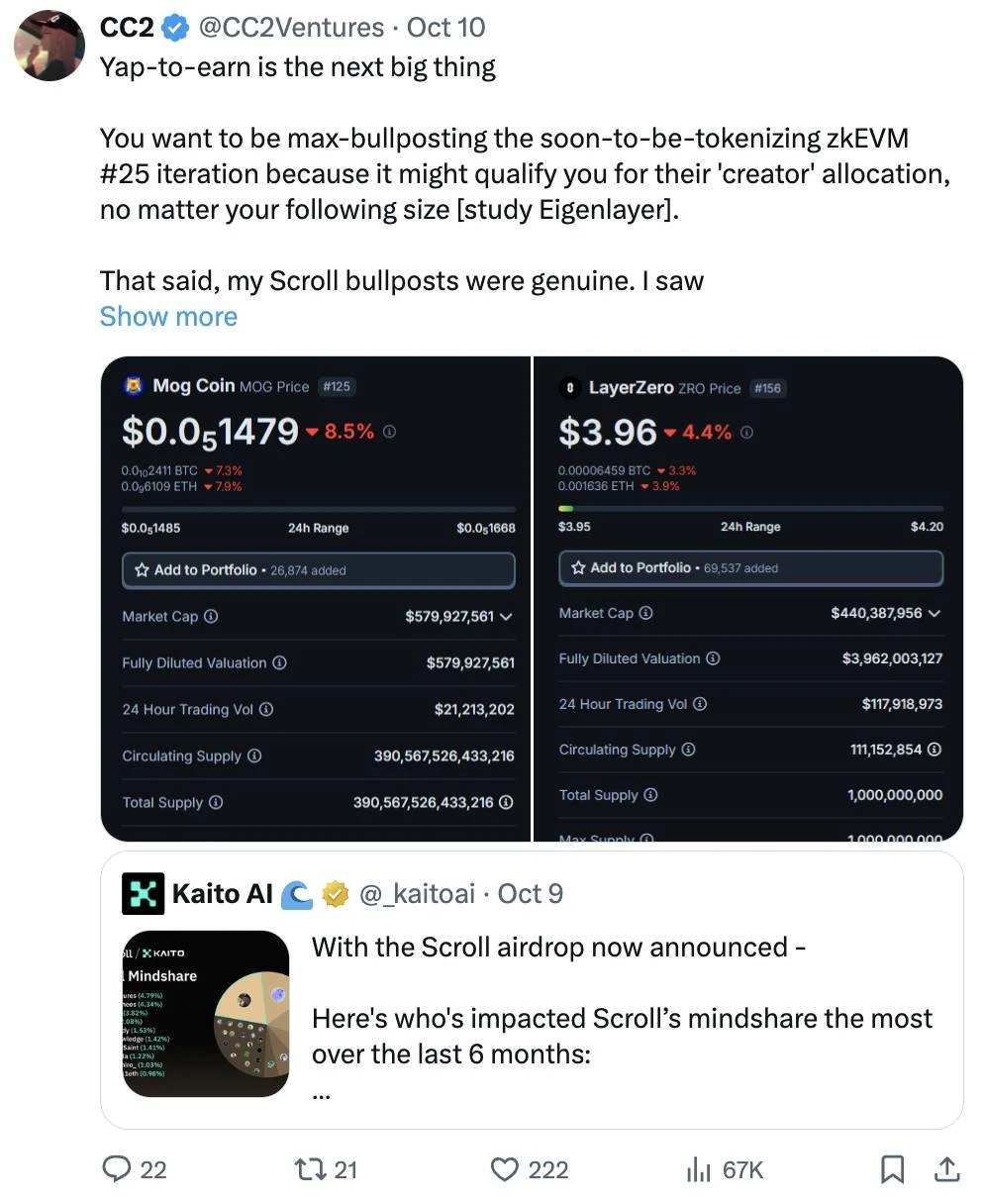 因此,请确保您在社交媒体上积极分享您最喜欢的项目,因为这可能会为您带来代币分配。Eigenlayer 和 Avail 只是 yap-to-earn 模式增长的两个例子。