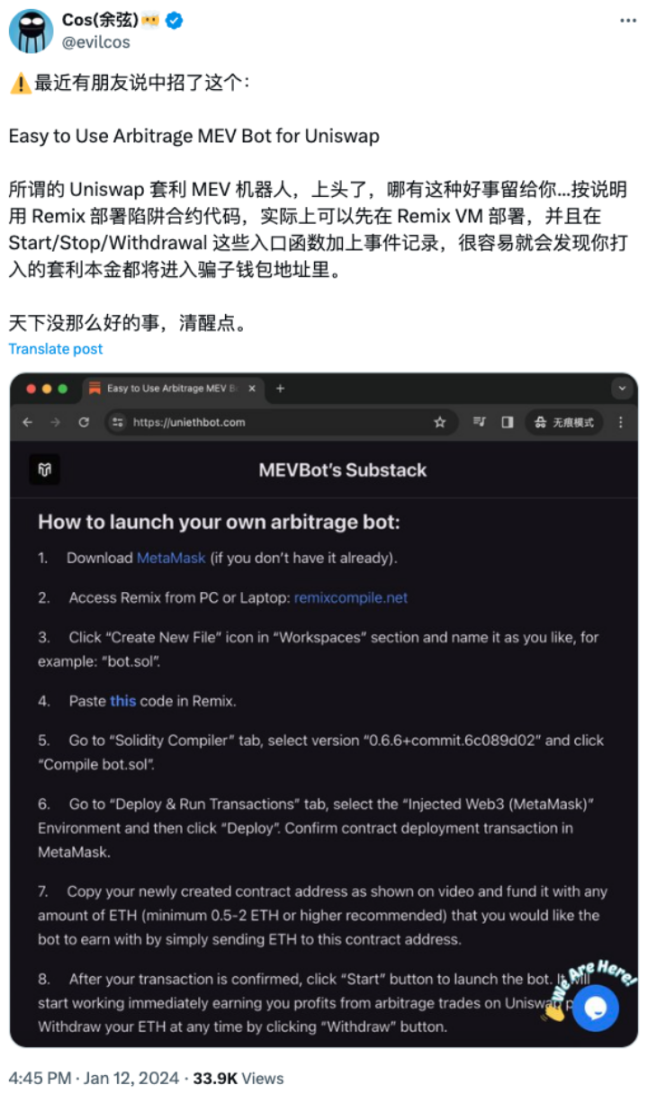 今年初,慢雾创始人 Cos 在 X 上提醒用户注意套利 MEV 机器人骗局,如今黑客团伙也是紧跟热点,骗局的名字也从「简单易用的 Uniswap 套利 MEV 机器人」变成了「ChatGPT 套利 MEV 机器人:如何使用滑点机器人每天完全被动地赚取 2000 美元」。慢雾安全团队注意到,近期因这类骗局受损的用户数量有所增加,因此,本文将讲解该骗局的套路和分析骗子的资金转移模式,帮助用户避免落入此类骗局。